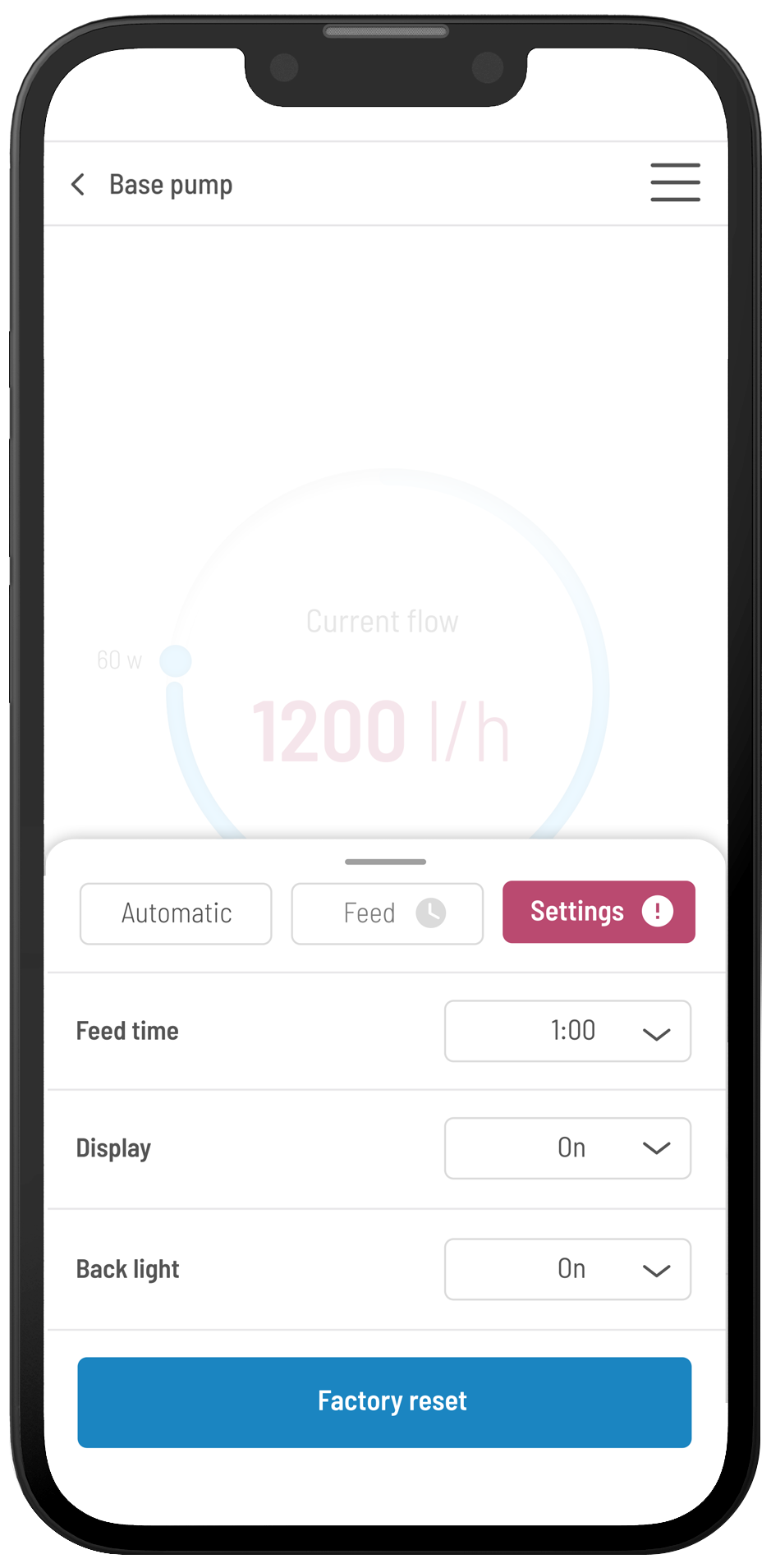 - Fütterungsmodus - Möglichkeit, die Pumpe aus der Ferne für eine Fütterungszeit anzuhalten und zu programmieren, nach welcher Zeit sie wieder in Betrieb gehen soll