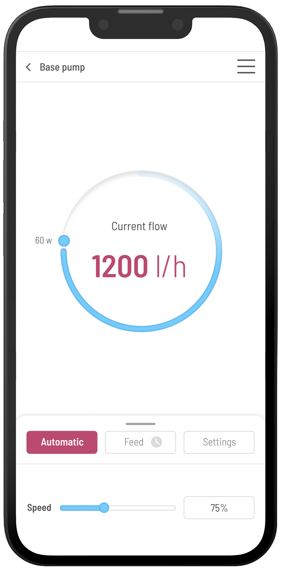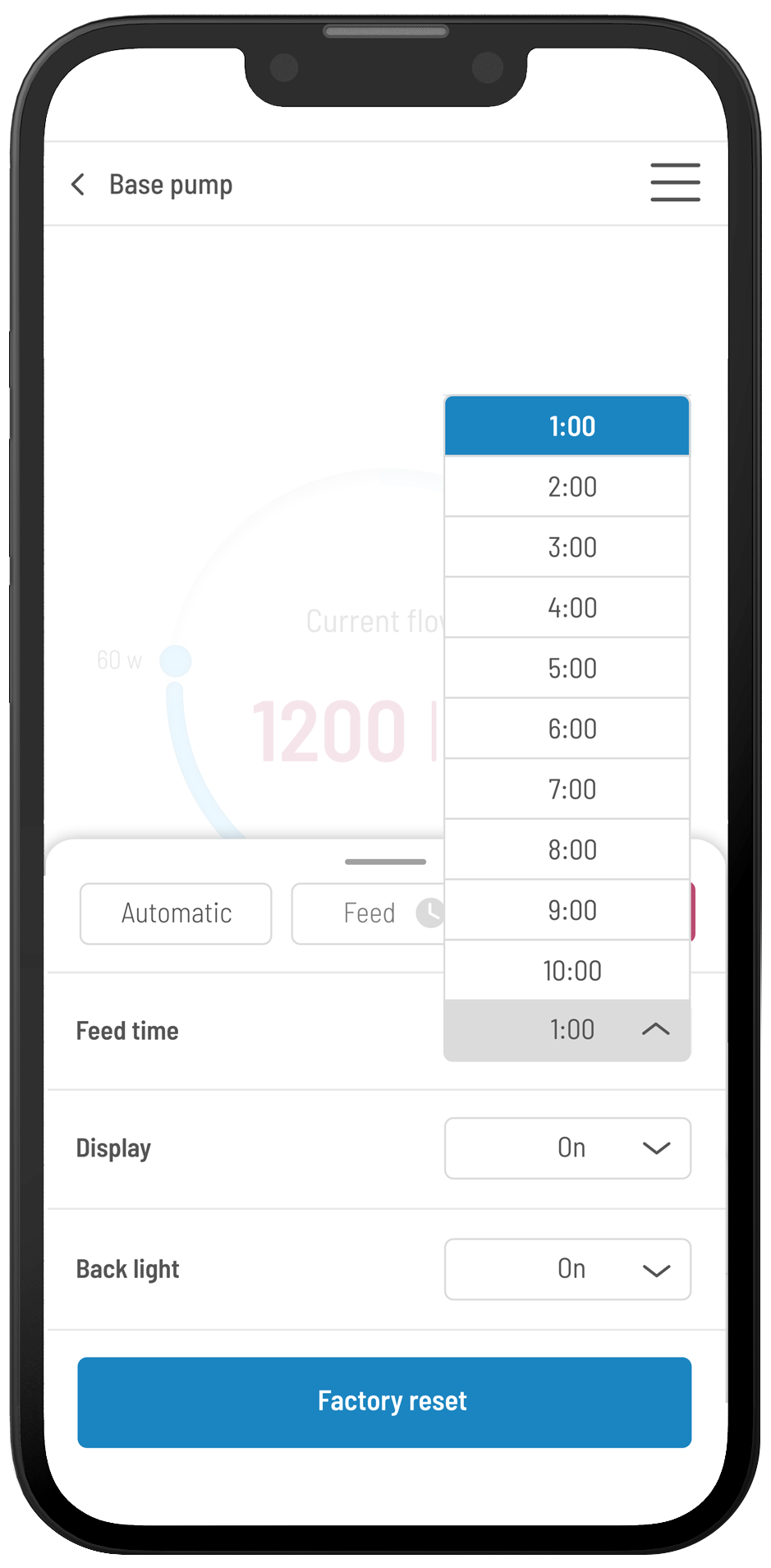 - Fütterungsmodus - Möglichkeit, die Pumpe aus der Ferne für eine Fütterungszeit anzuhalten und zu programmieren, nach welcher Zeit sie wieder in Betrieb gehen soll