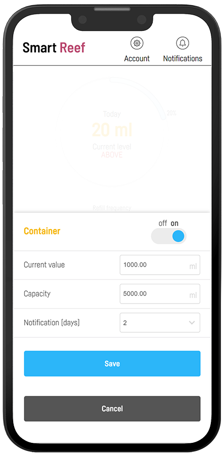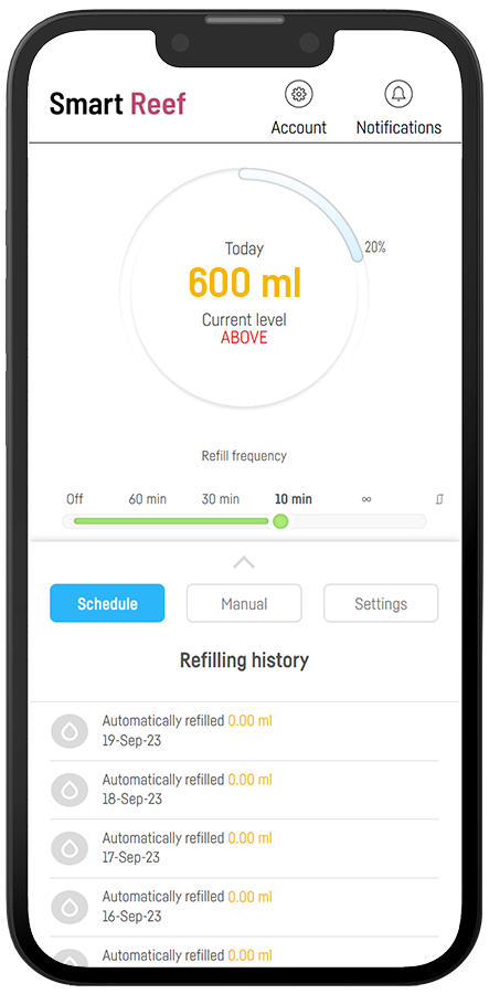 Dank präziser Daten ist die Überwachung der zugefügten Wassermenge zum System sehr einfach. Die Smart Reef-Anwendung ermöglicht es Ihnen, einen Alarm einzustellen, der Sie über den verbleibenden Wasserstand im Nachfüllbehälter informiert. Darüber hinaus ist die Lösung von Reef Factory im Gegensatz zu herkömmlichen Pumpen, die in automatischen Nachfüllungen verwendet werden, rostfrei, dank der Verwendung einer Dosierpumpe.