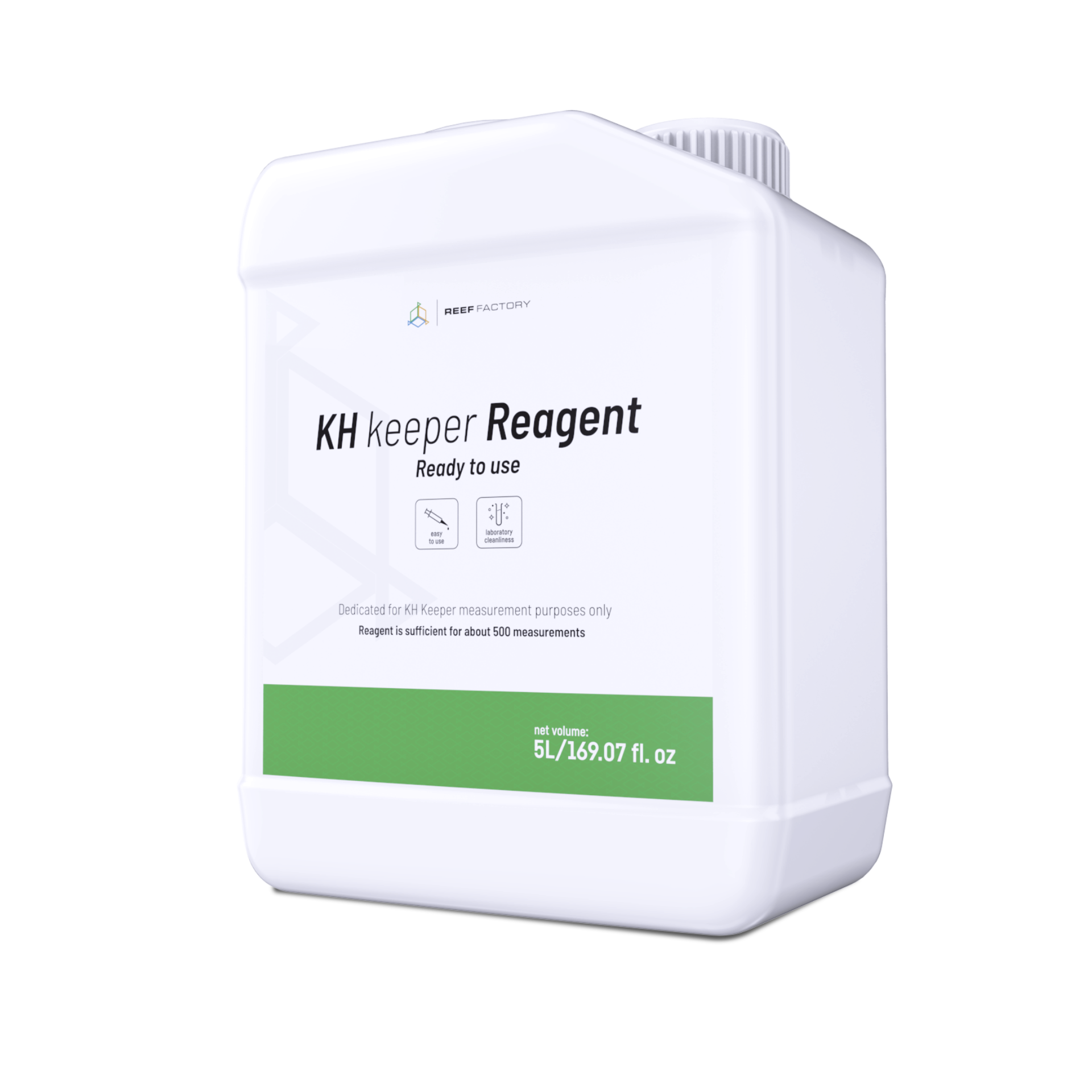 Fertige Reagenz für die Prüfung der Karbonathärte von Wasser in einem Meerwasseraquarium mit dem intelligenten Messgerät Reef Factory - KH keeper Plus. Dieses Gerät entnimmt selbstständig Wasser aus dem Aquarium für den Test, führt die Messung durch und speichert das Ergebnis in der Smart Reef App. Sie können die Ergebnisse und den Messverlauf jederzeit in der App einsehen.