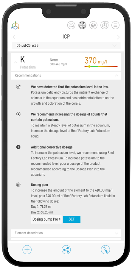 Bedürfnissen, und alle Ergebnisse sind über die Smart Reef App leicht zugänglich, entweder in einem klaren Parameters-Panel oder ICP-Panel. Die Anwendung schlägt detaillierte Empfehlungen zur Ergänzung vor, um die bestmögliche Umgebung für Korallenaufrechtzuerhalten. Diese Empfehlungen werden an Dosierpumpen übertragen, die dann die empfohlenen Mengen unserer hochwertigen Reef Care-Produkte präzise dosieren und so den Tieren lebenswichtige Elemente im Wasser zuführen.