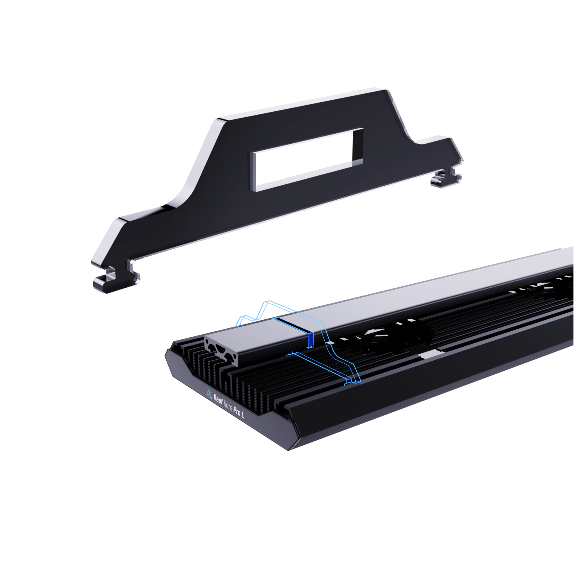 Der Griff besteht aus Kunststoff und benötigt keine Schrauben, um die Reef Flare Pro Lampe in den Größen S, M und L an der Reef Flare Profilschiene und dem Reef Flare Pro Profil zu befestigen. Die Montage ist schnell und einfach, sie besteht darin, den Reef Flare Pro Profilaufhänger in die dafür vorgesehenen Löcher in der Lampe einzusetzen, und dann die gesamte Lampe mit den Reef Flare Pro Profilschienenhaltern.