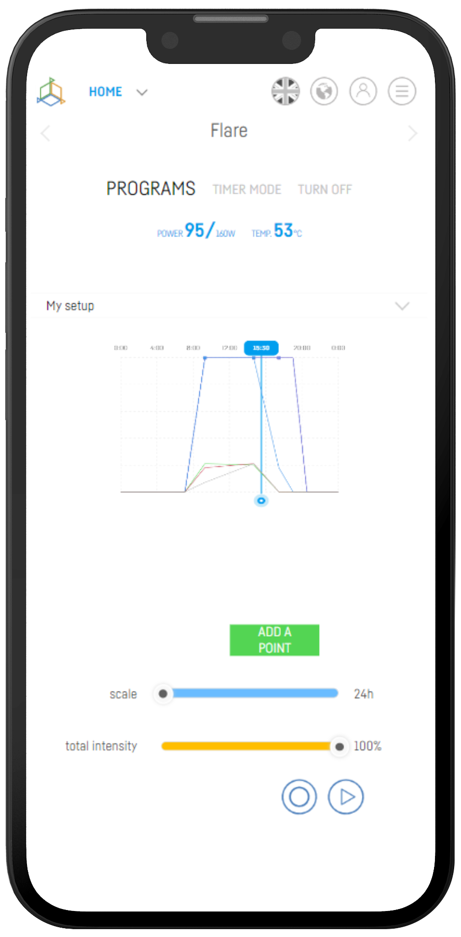 Ein neues, verbessertes Lichtmanagement-Panel. Größere Schieberegler, die Möglichkeit, den Prozentsatz jedes Farbkanals einzugeben. Ebenfalls hinzugefügt wurde der Power-Schieberegler, mit dem Sie bei der Programmierung die Gesamtintensität des Lichts über alle Kanäle hinweg einfach einstellen können.