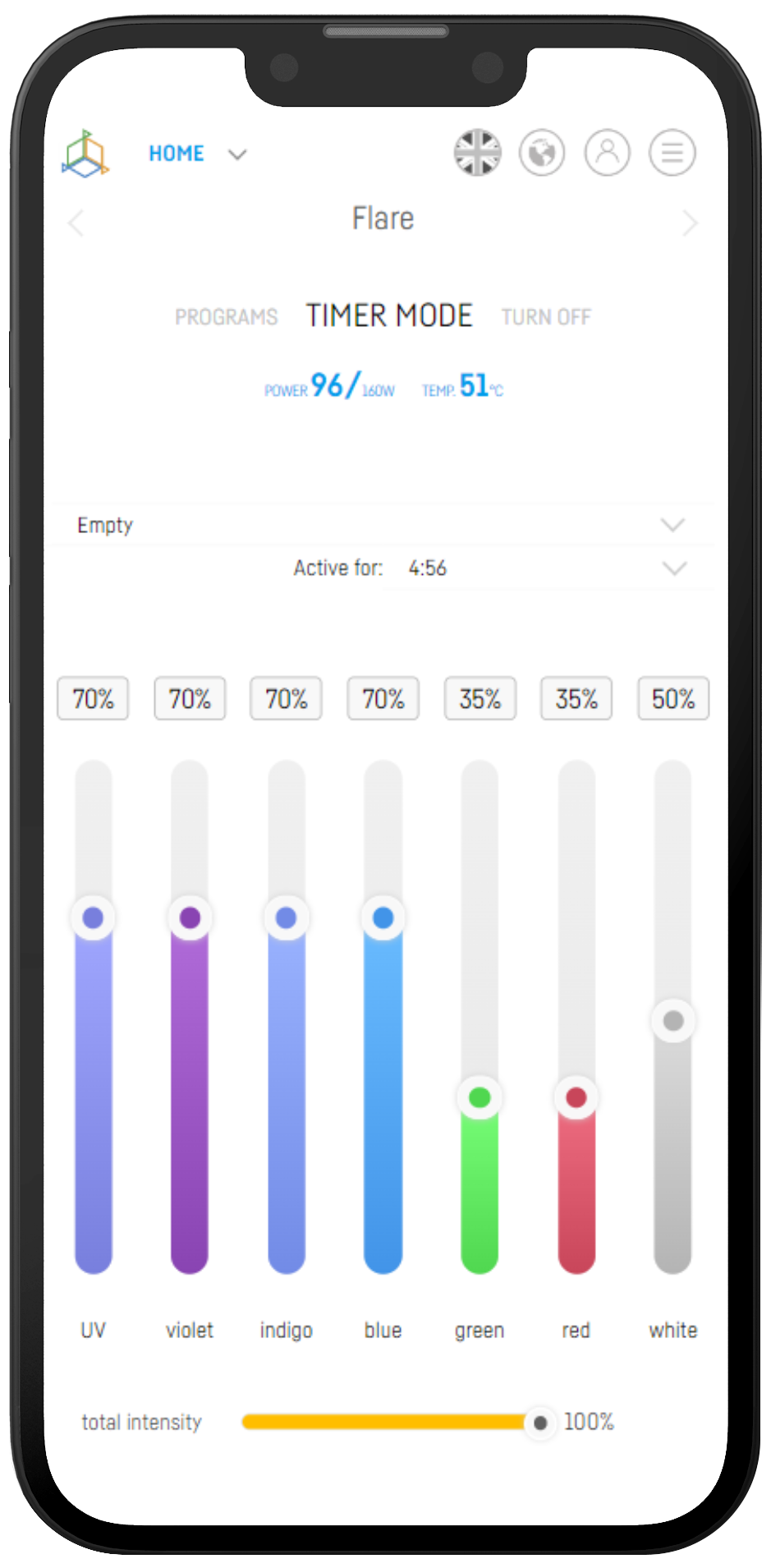 Ein neues, verbessertes Lichtmanagement-Panel. Größere Schieberegler, die Möglichkeit, den Prozentsatz jedes Farbkanals einzugeben. Ebenfalls hinzugefügt wurde der Power-Schieberegler, mit dem Sie bei der Programmierung die Gesamtintensität des Lichts über alle Kanäle hinweg einfach einstellen können.