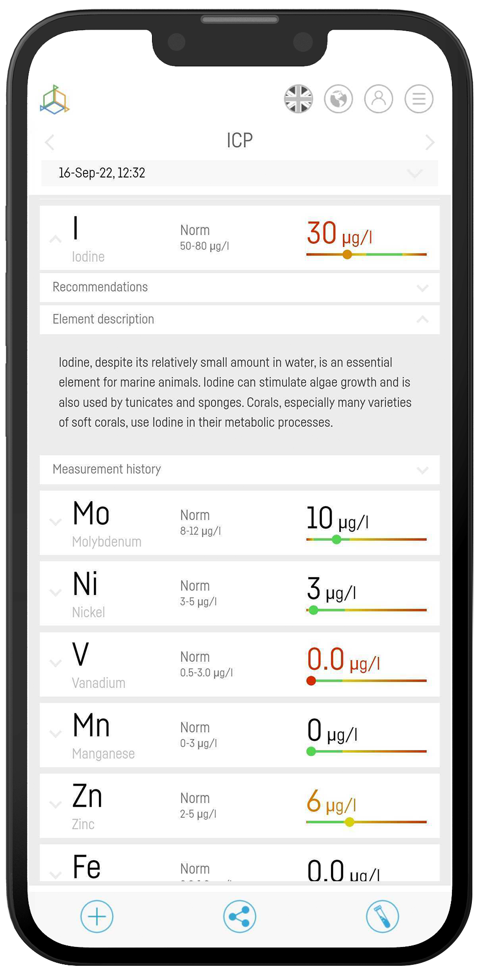 📲 Nach dem Test erscheinen deine Ergebnisse mit detaillierten Empfehlungen direkt im ICP-Panel der Smart Reef App 😎 alle Fragen werden ausführlich erklärt und in einem zugänglichen und praktischen Format dargestellt!