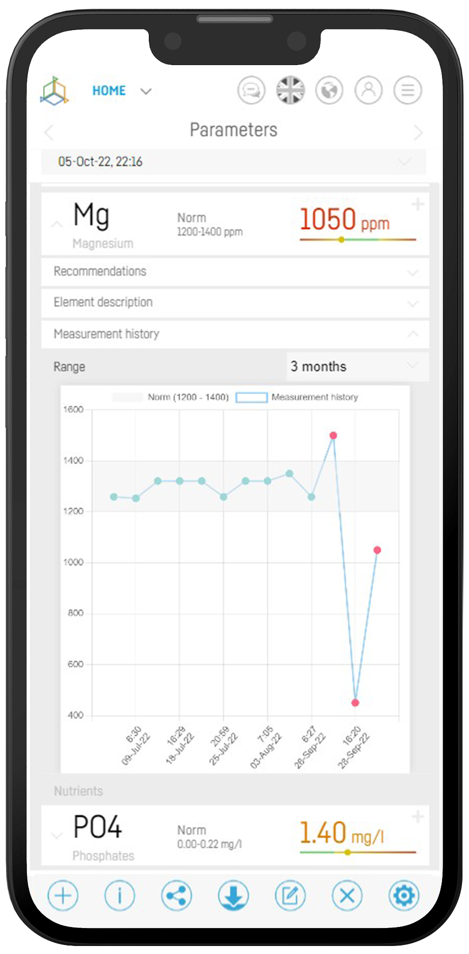 Mit Smart Reef bekommt der Falltest eine ganz neue Bedeutung. Dank der Integration in die App und damit in das Dosierpanel wird die Interpretation der Ergebnisse zum Kinderspiel. Anhand der Ergebnisse, die auf einer übersichtlichen Skala dargestellt werden, sehen wir leicht zu interpretierende Empfehlungen, wie Sie den Parameter im optimalen Bereich halten können. Darüber hinaus speichert das Dosierpanel Ihren Messverlauf und ermöglicht es Ihnen, Ihren Parameterverlauf bequem mit anderen Hobbyisten zu teilen. Viel Komfort, 1 App!