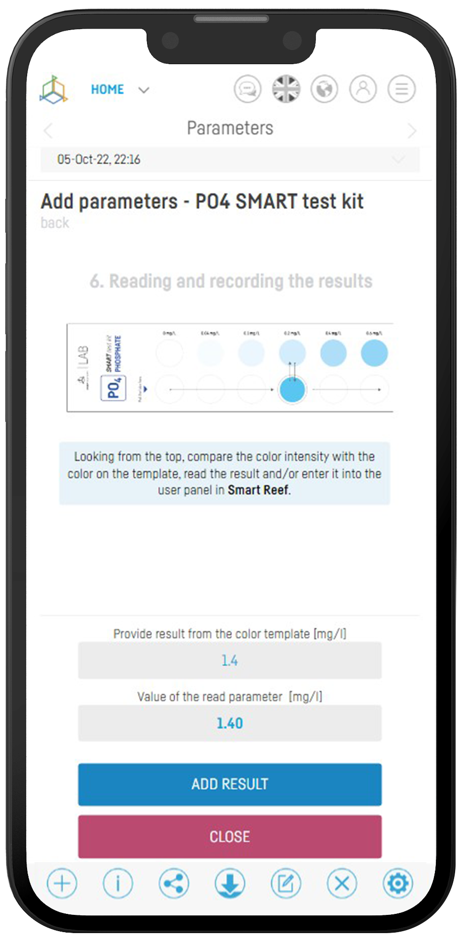 6) Schauen Sie von oben und vergleichen Sie die Farbintensität mit der Farbe auf der Farbkarte, lesen Sie das Ergebnis ab und/oder in der Benutzeroberfläche von Smart Reef eingeben.