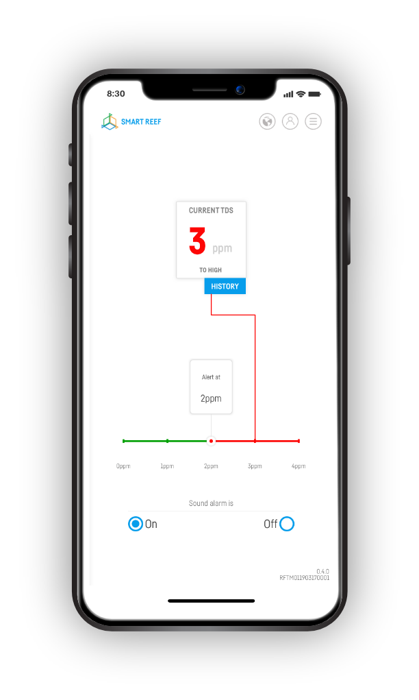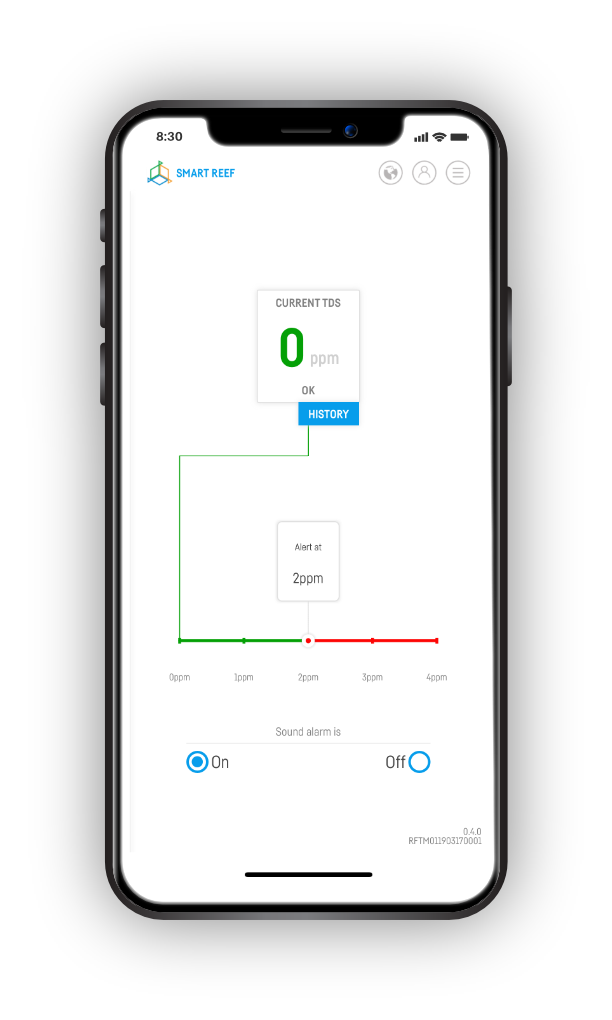 Die Daten können online eingesehen werden und das Gerät kann über einen Browser auf dem Laptop oder eine App auf Ihrem Smartphone konfiguriert werden. Der TDS-Wert wird deutlich angezeigt. Das Gerät kann unabhängig arbeiten oder Sie können es mit der Smart Reef-App verbinden.